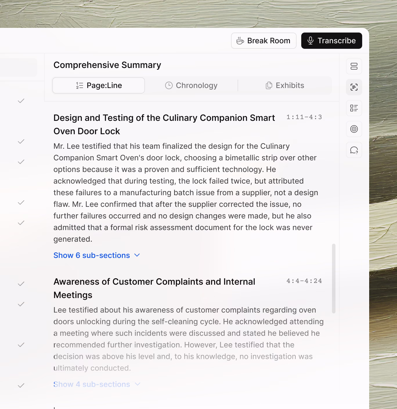 Traditionally after a four-hour deposition, you might be looking at 2 weeks of wait time and 10+ hours of review. Deposely gives you an instant AI rough transcript, complete with our best-in-class interactive summaries so you can move from deposition to next steps without delay.