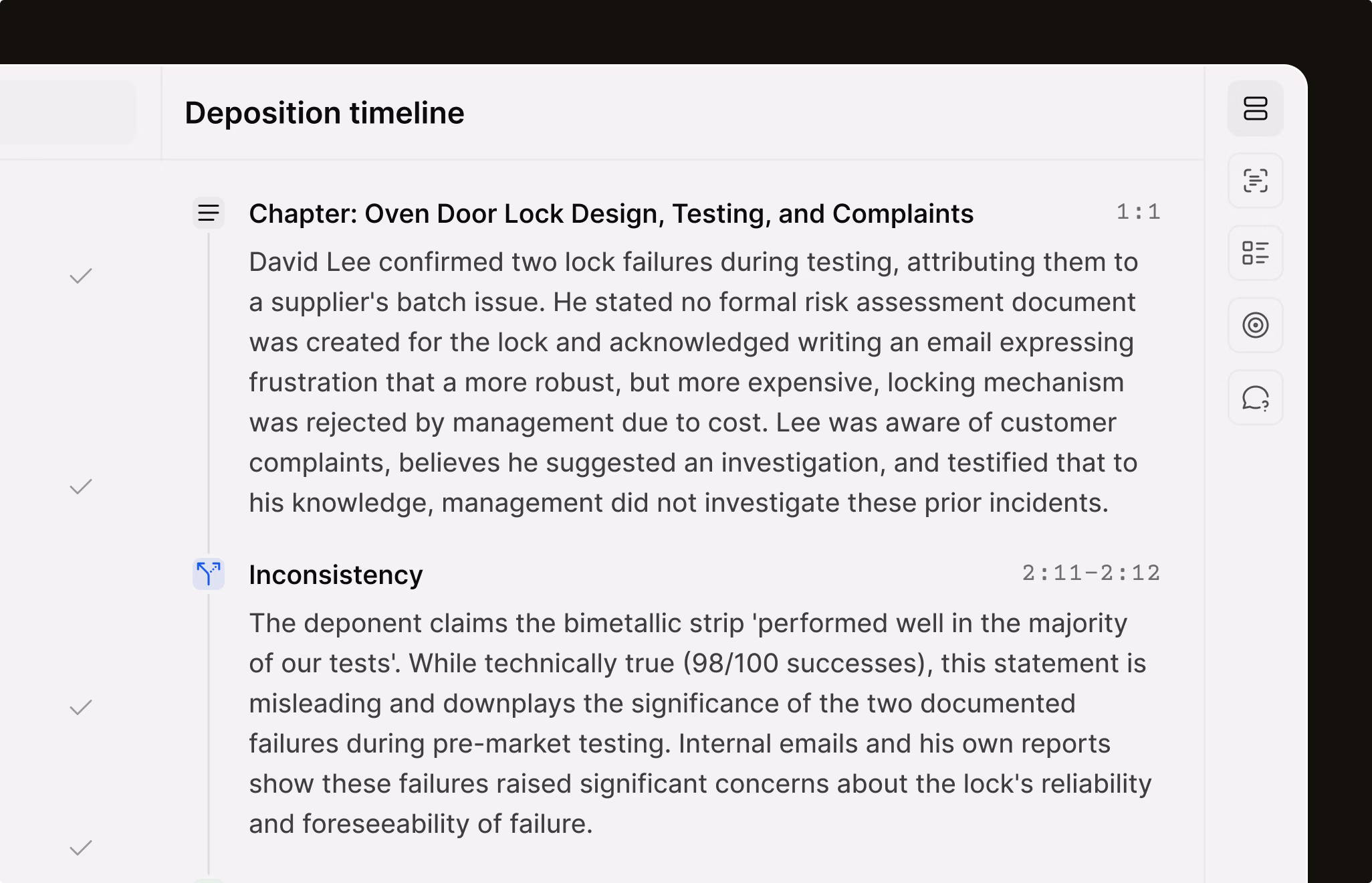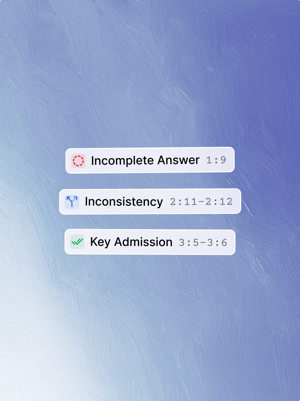 From crucial admissions to procedural milestones, Deposely highlights the moments that define your case. Don't hunt for the "smoking gun"—let the testimony speak for itself.